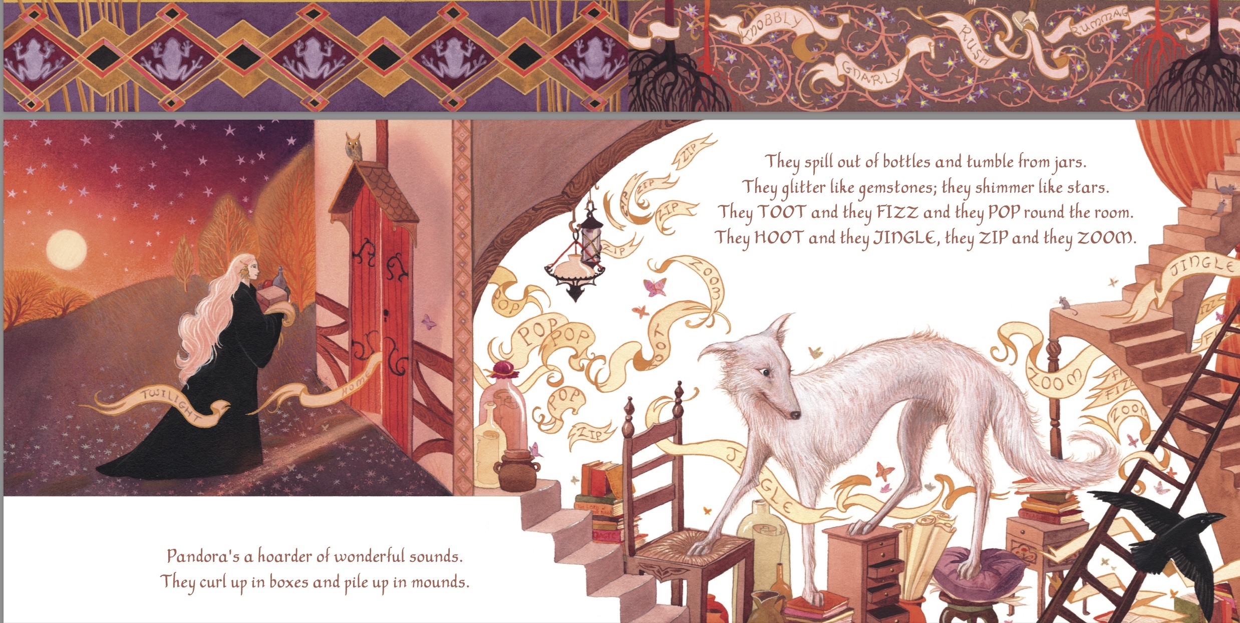 The story begins with Pandora, a lover of language who collects words and sounds and  crafts them into stories to be sent into the world.